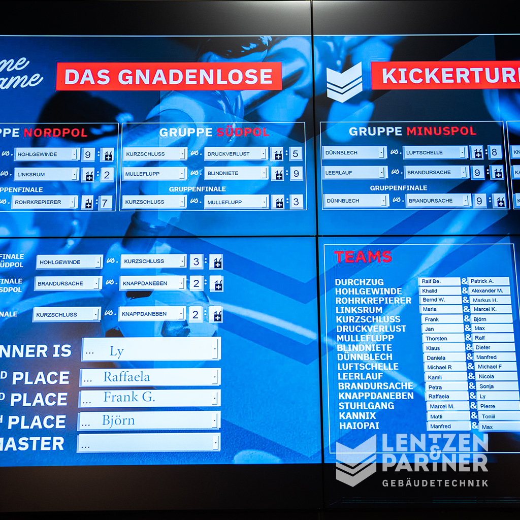 Am Freitag, den 18.11.2022 ging es ordentlich zur Sache… im verkürzten Feierabend um 14 Uhr traten 16 bestgelaunte 2er-Teams beim ersten „FAME or SHAME“ - KICKERTURNIER im Forum der Lentzen Gebäudetechnik GmbH an. Im K.O.-System konnte sich das Team „Knappdaneben“ - bestehend aus Van Ly & Raffaela - erst als Gruppensieger, dann bis ins Finale durchkickern und rasierte im gnadenlosen Gipfeltreffen das bis dato ebenfalls erfolgreiche Team „Kurzschluss“ eindeutig mit 10:2.